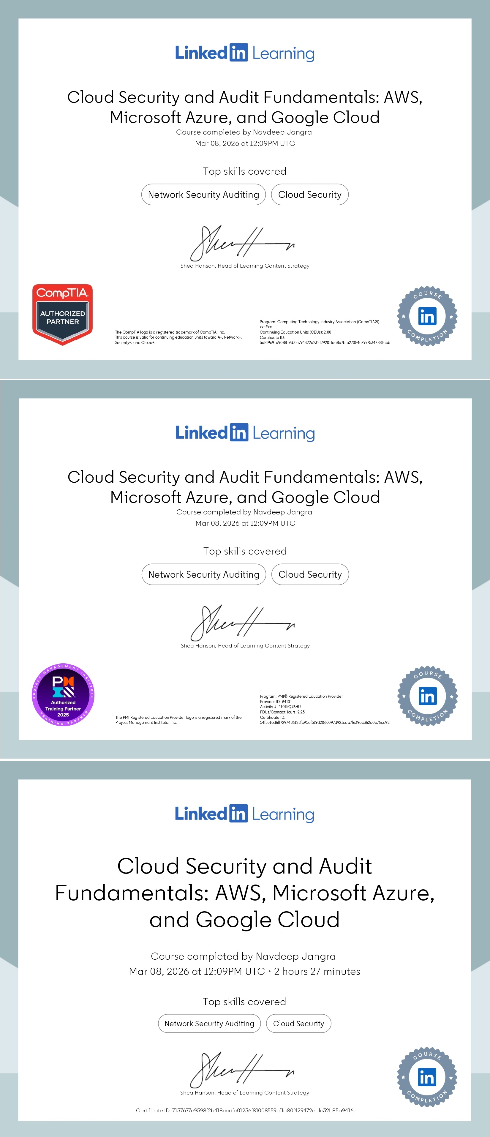 Learned cloud security concepts across AWS, Azure, and Google Cloud, including auditing and risk management.